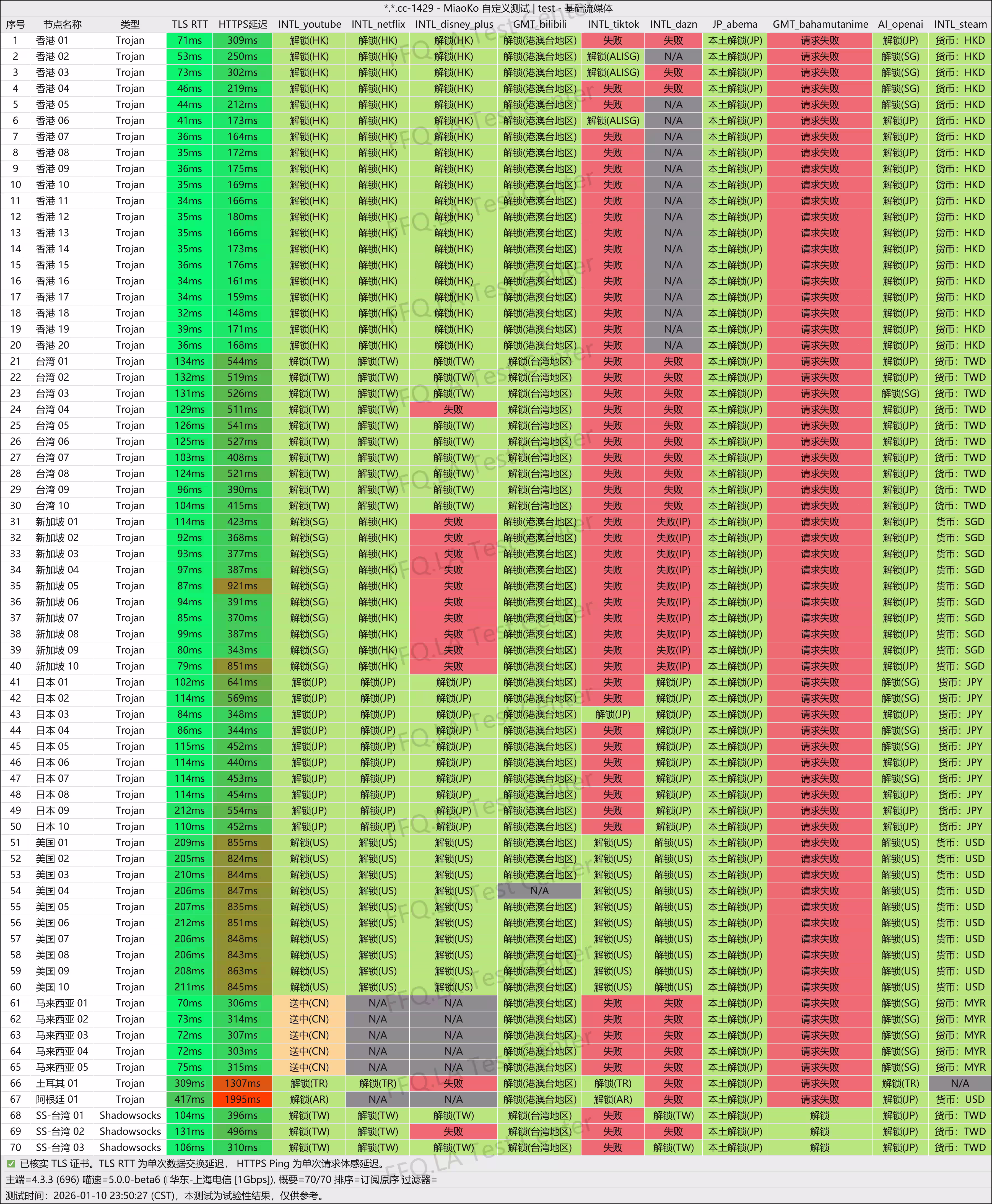 龙猫云2026年1月10日 测试结果(本次测试流媒体全绿,日本速度千兆跑满无压力,推荐购买)