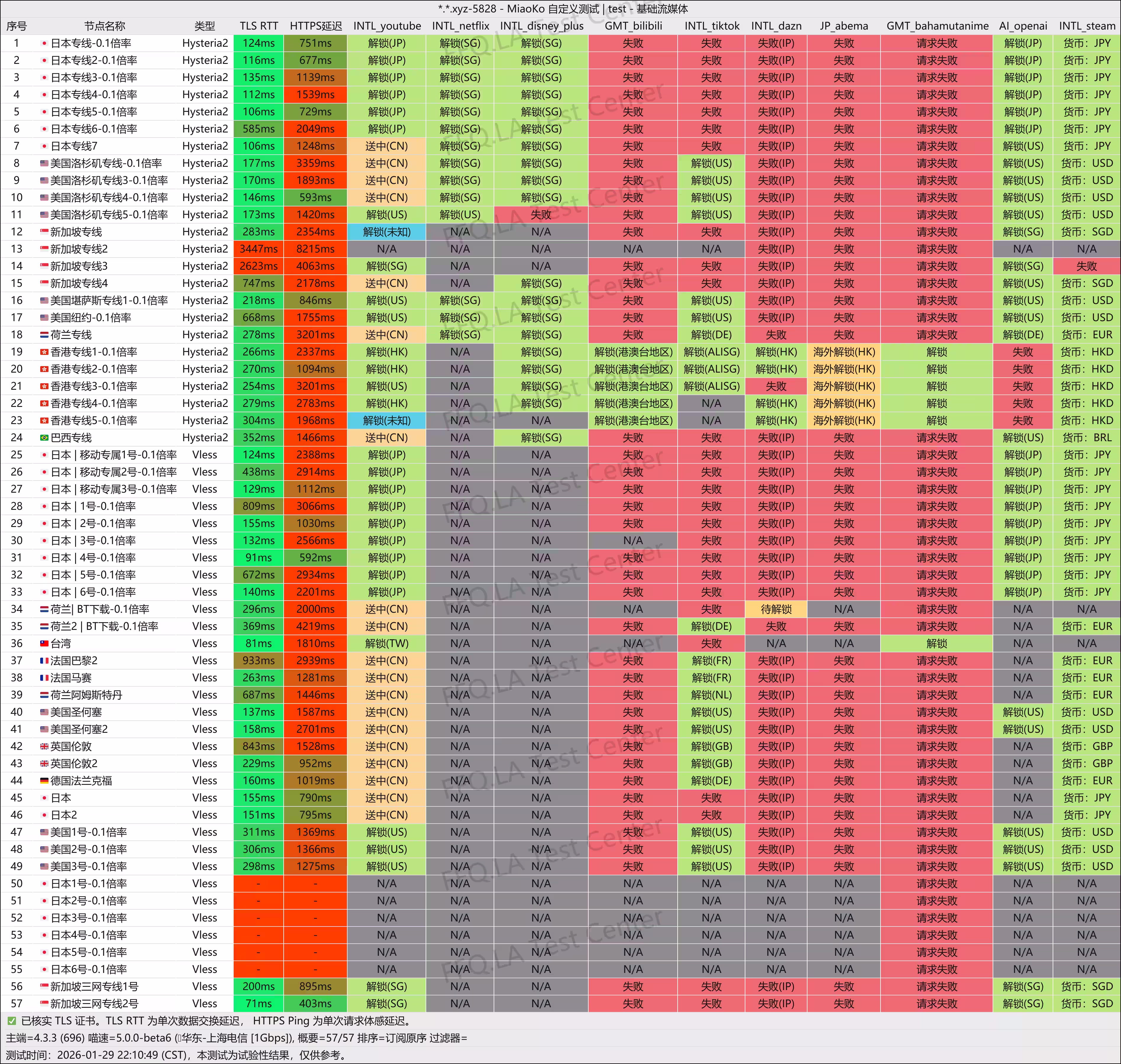 一分机场2026年1月29日 测试结果(本次测试流媒体全绿,香港节点速度千兆跑满无压力,推荐购买)
